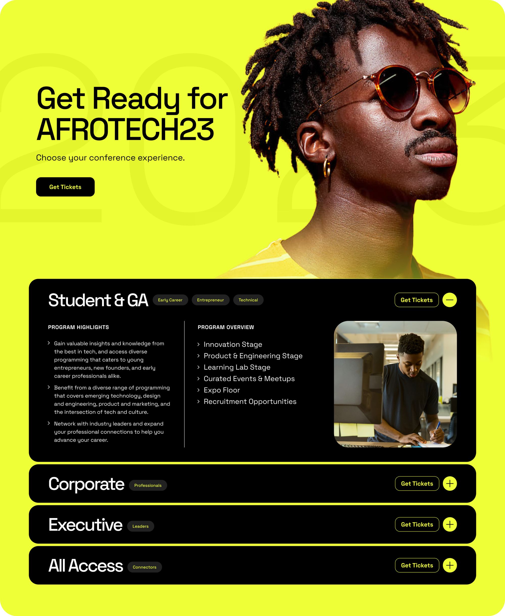 We designed and built the AFROTECH Conference website to support an event drawing more than 40,000 attendees, balancing clarity, energy, and performance under real-world demands. The experience needed to communicate credibility to enterprise partners while remaining welcoming and inspiring to first-time attendees. Through clear information architecture, bold editorial moments, and scalable design systems, the site supports recruiting, programming discovery, and networking—positioning AFROTECH as both a career catalyst and a cultural force shaping the future of technology.